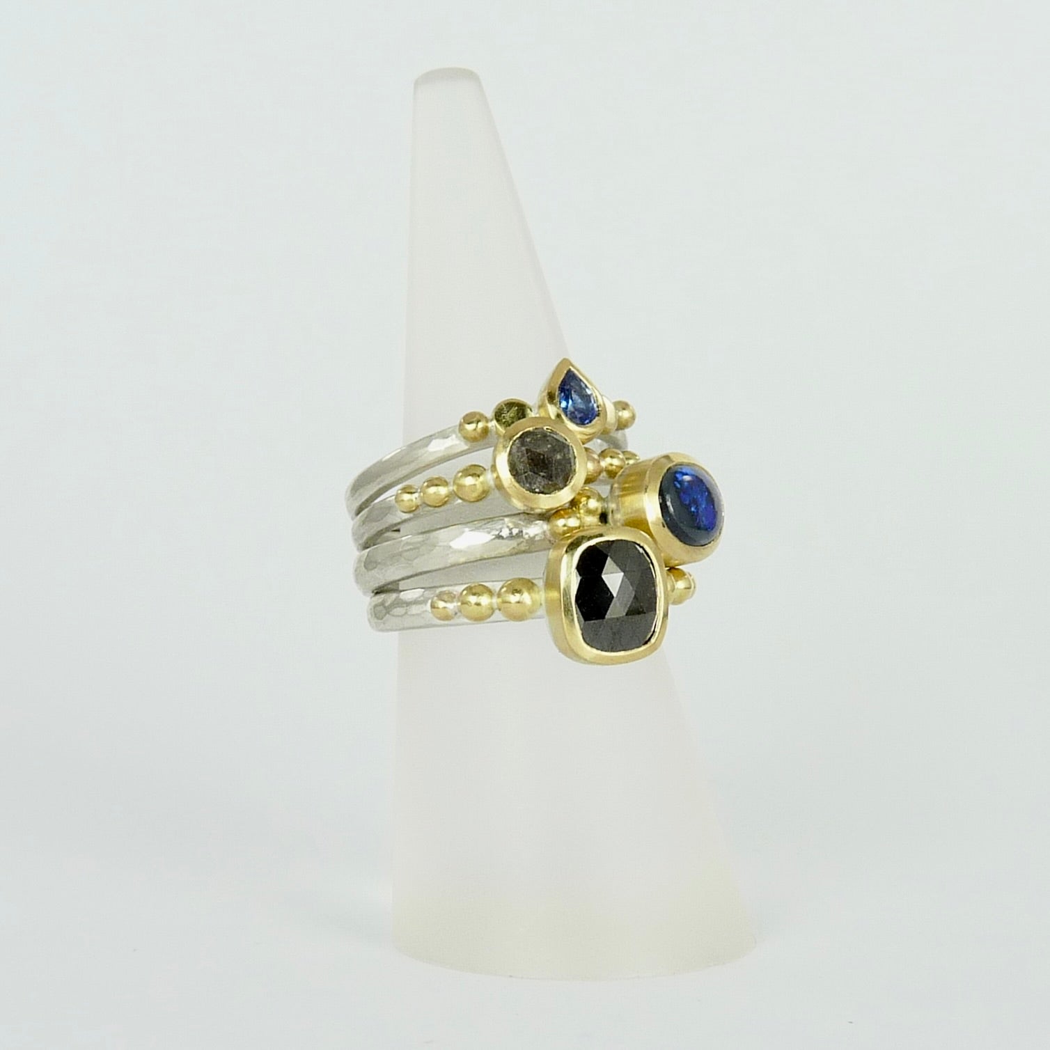 A beautiful checker board cut black diamond set in 18ct gold with granulations on a silver band