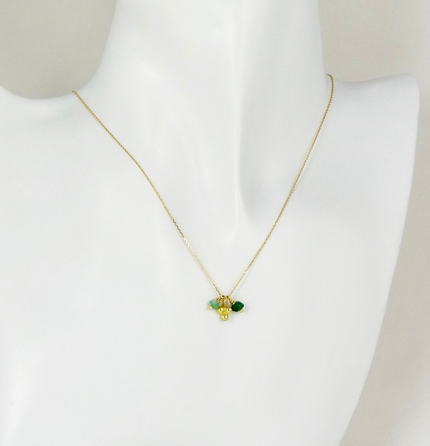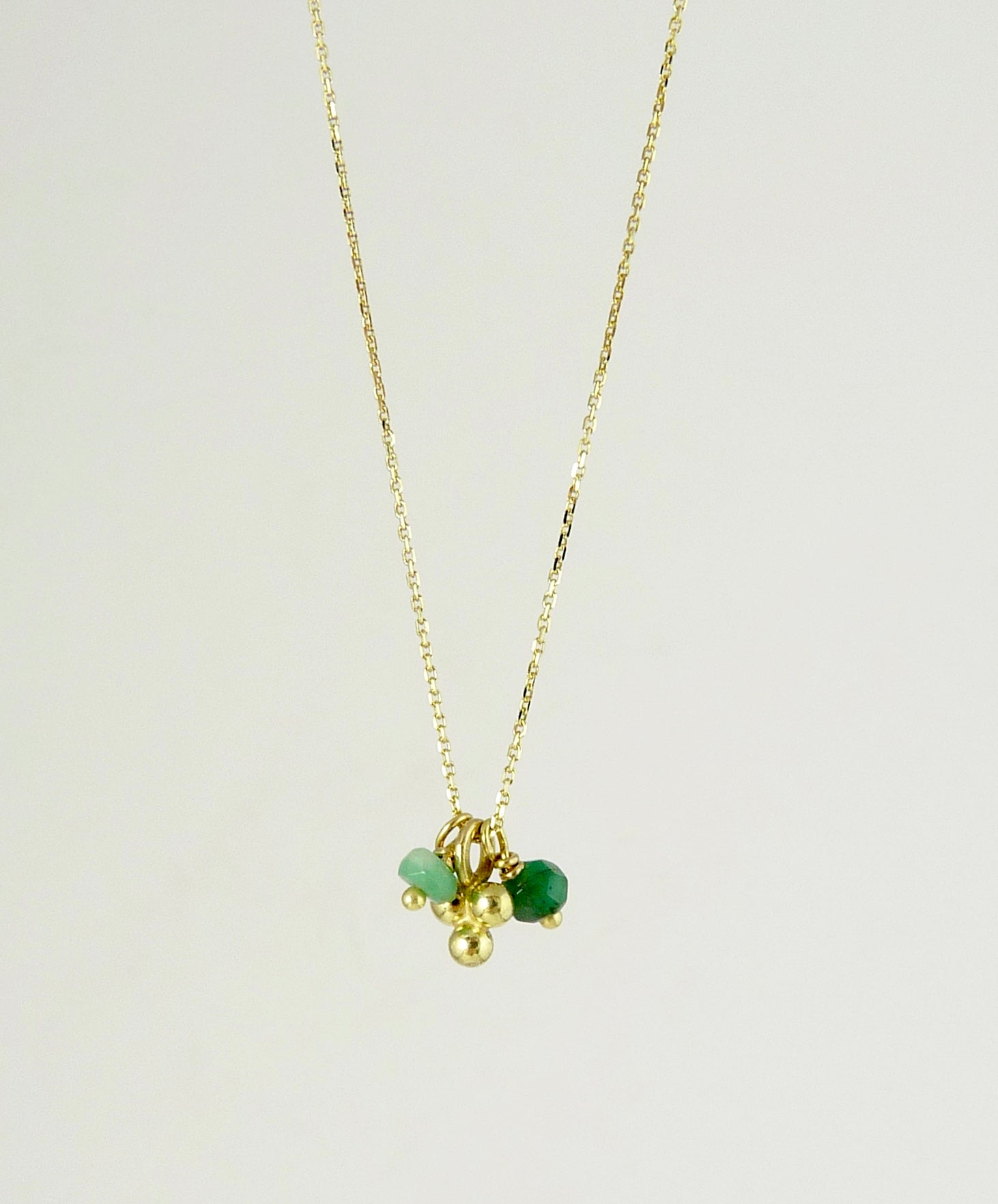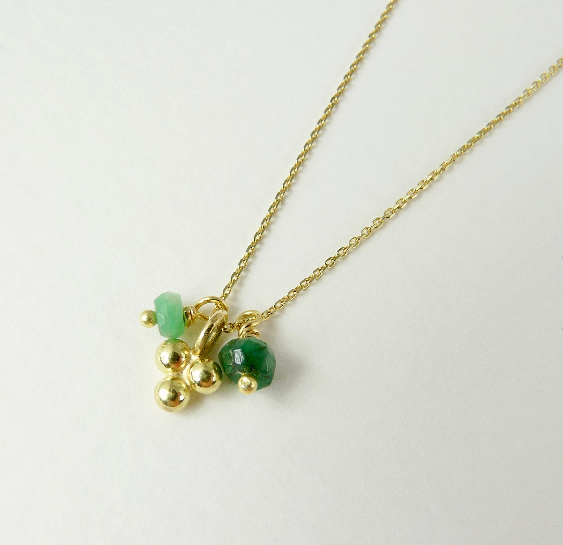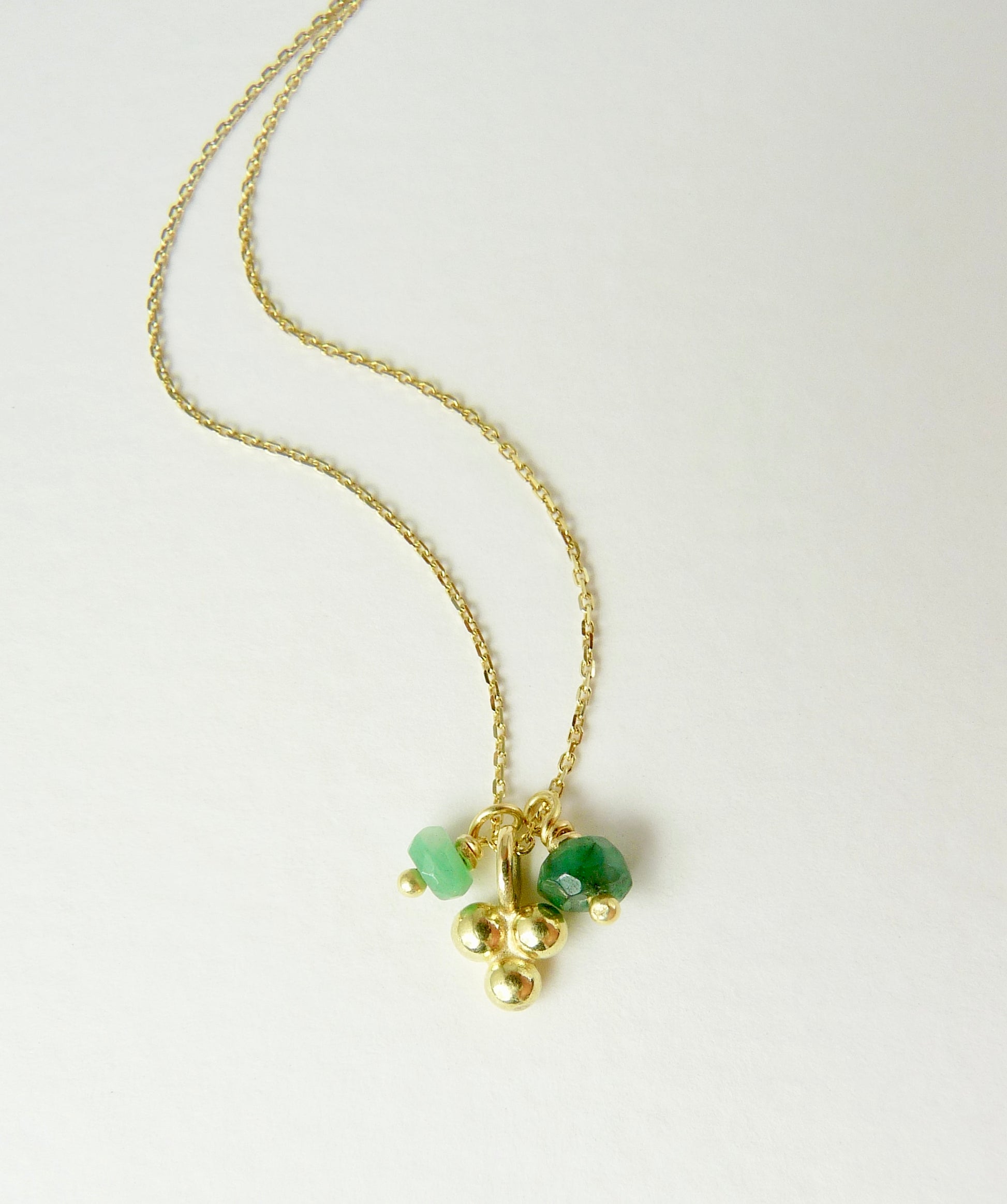The triple granulation is made from 18ct yellow gold and the faceted beads are emeralds