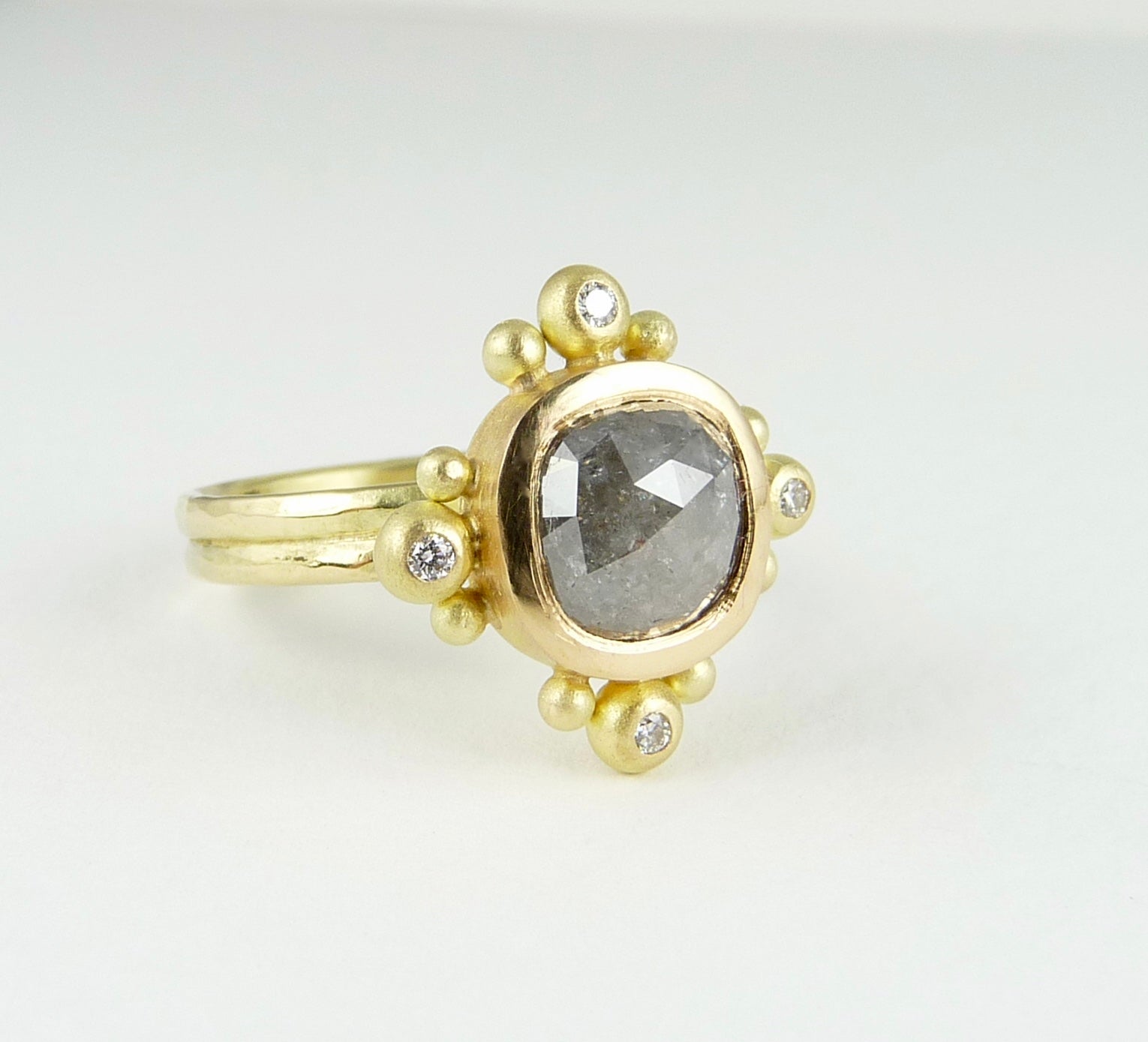 Set with a gorgeous 2.10ct grey rose cut diamond, bright white diamonds and made in 18ct gold with a 22ct gold setting edge
