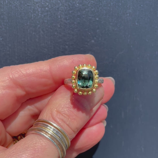 A cushion cut gorgeous green tourmaline set in 22ct gold with 18ct granules and silver band