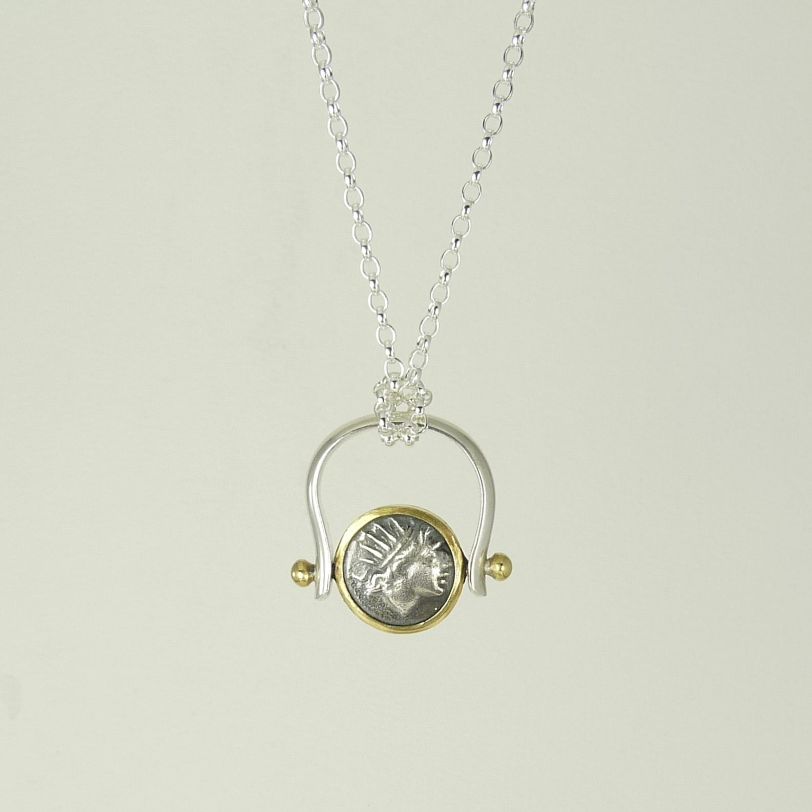 In the images we have turned the coin flat so a chain can be looped through and he can be worn as a pendant