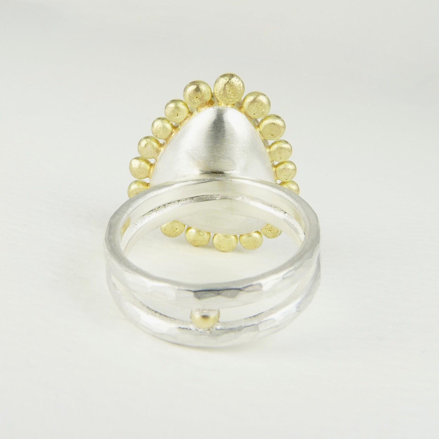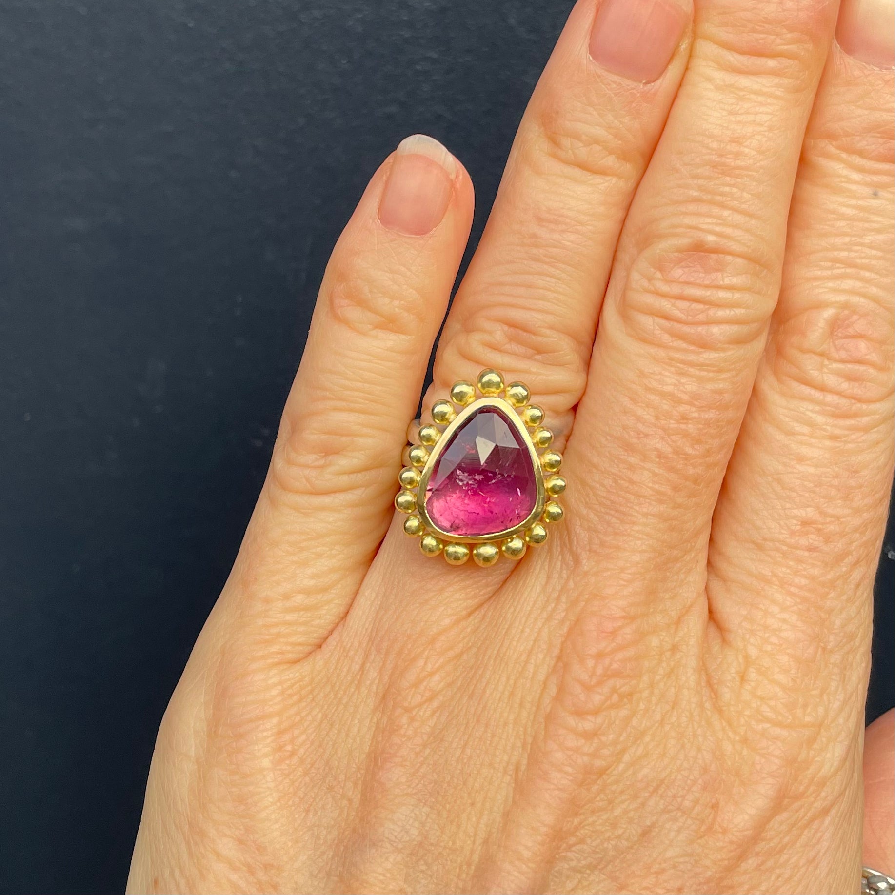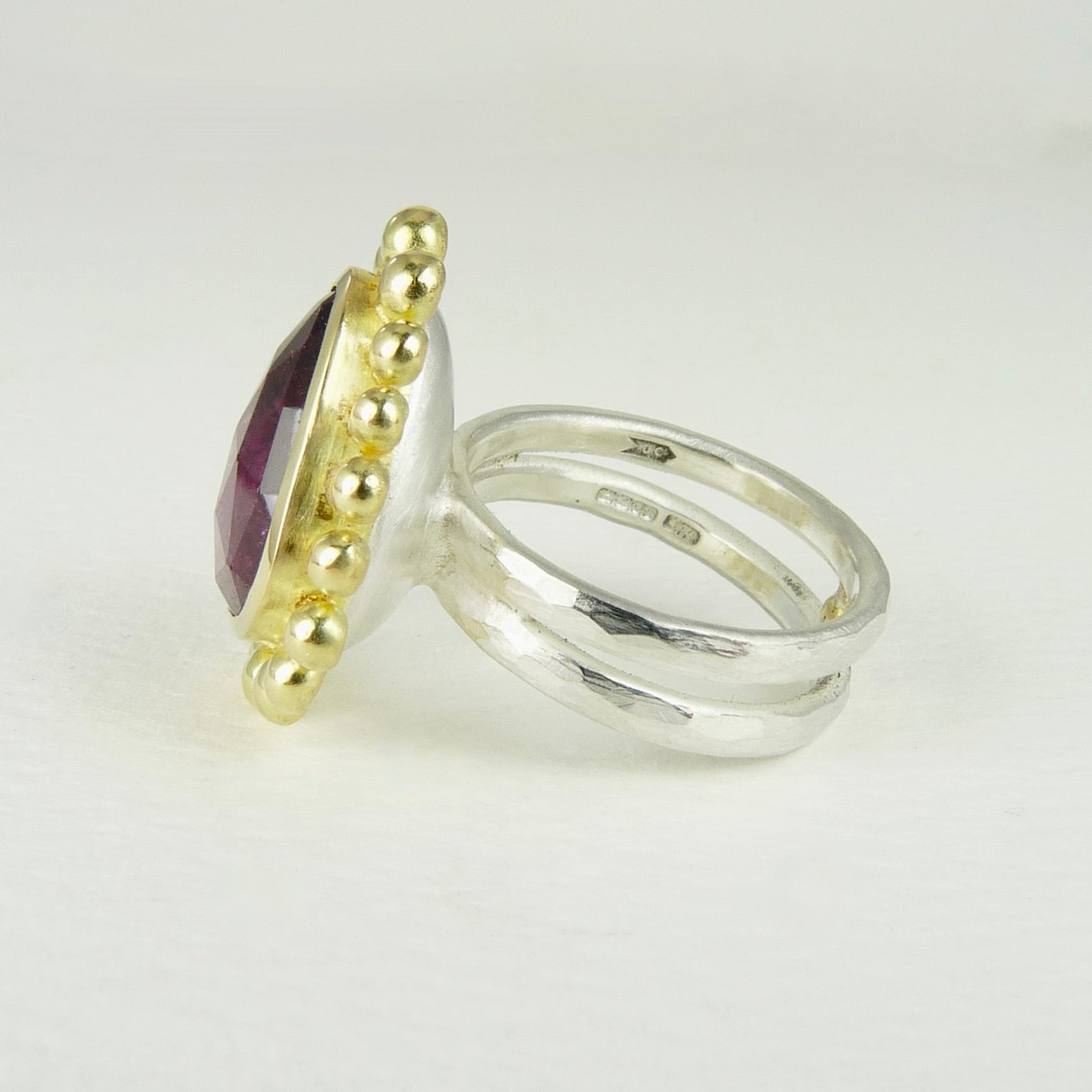 An amazing deep pink rose cut irregular shaped pink tourmaline, 18ct gold setting and balls with double silver band and 18ct ball detail at the back