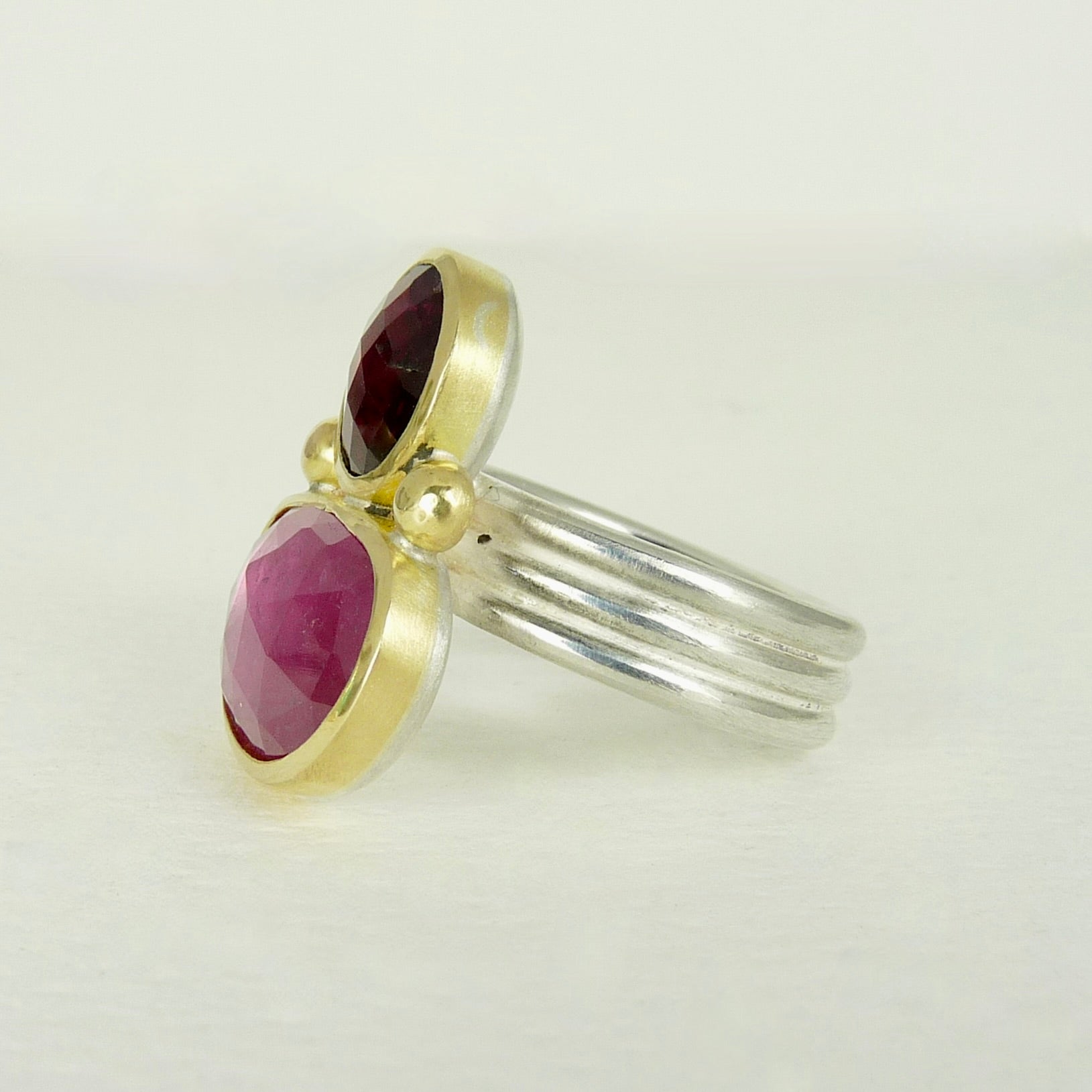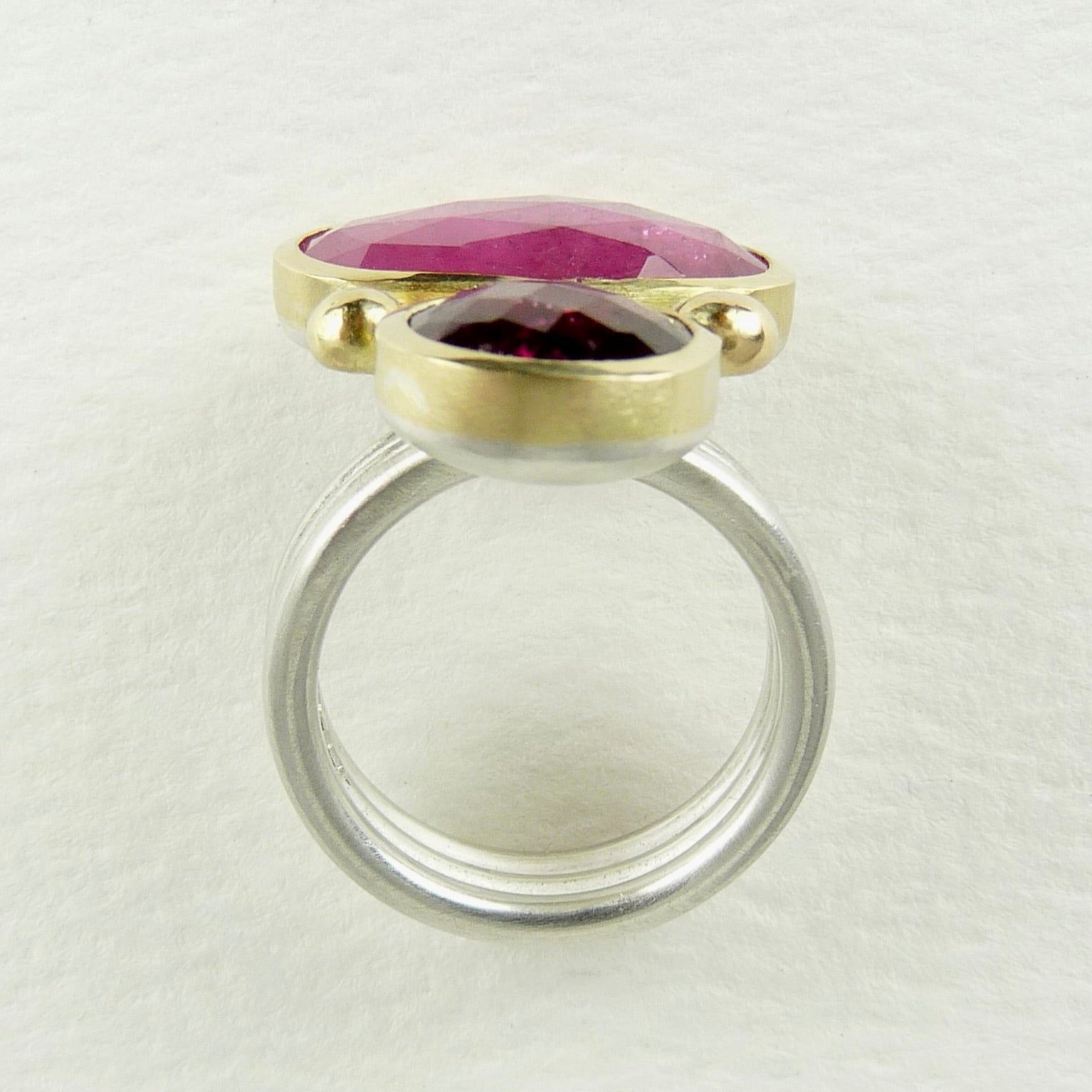 Two gorgeous shades of pink tourmaline set together in this lovely irregular double stone ring