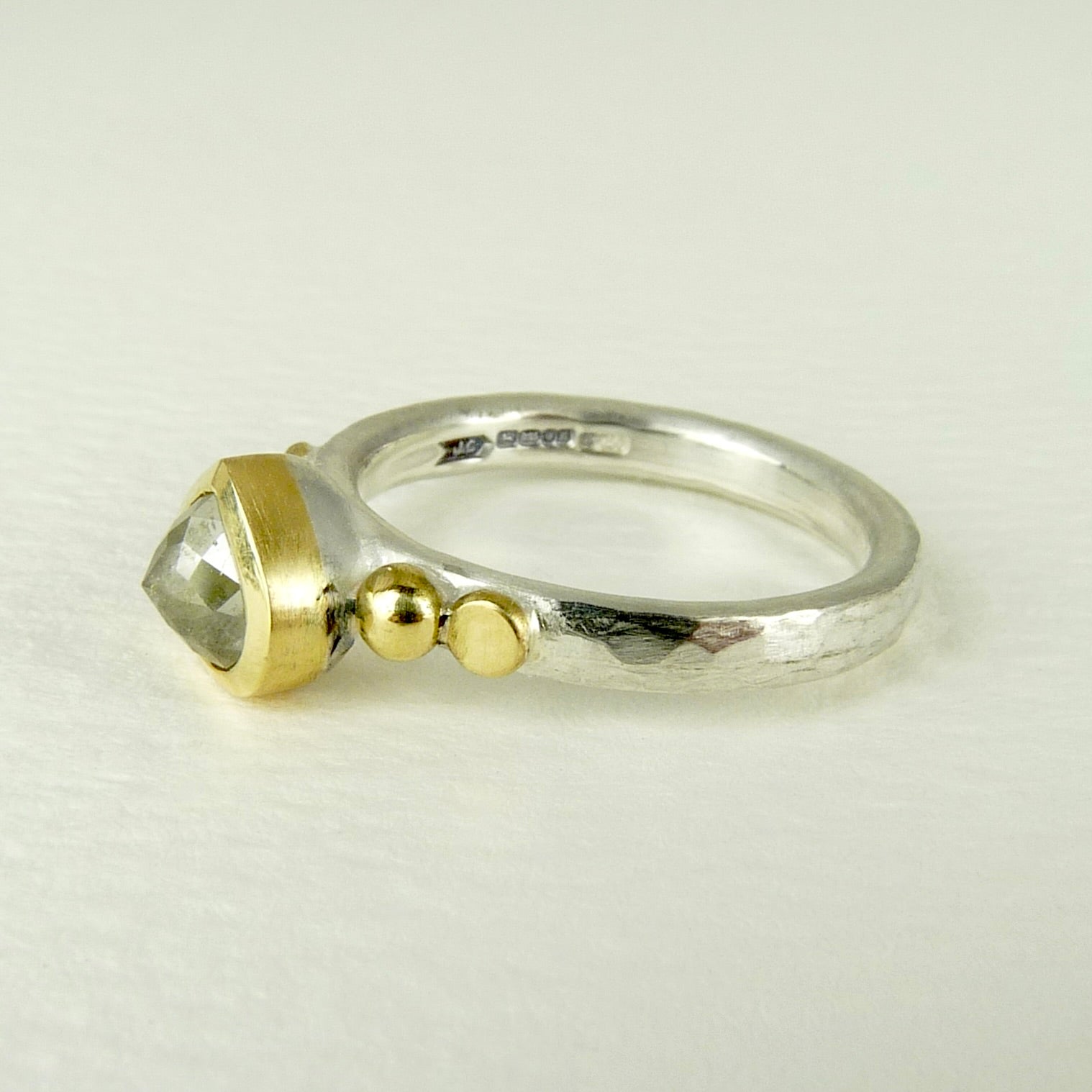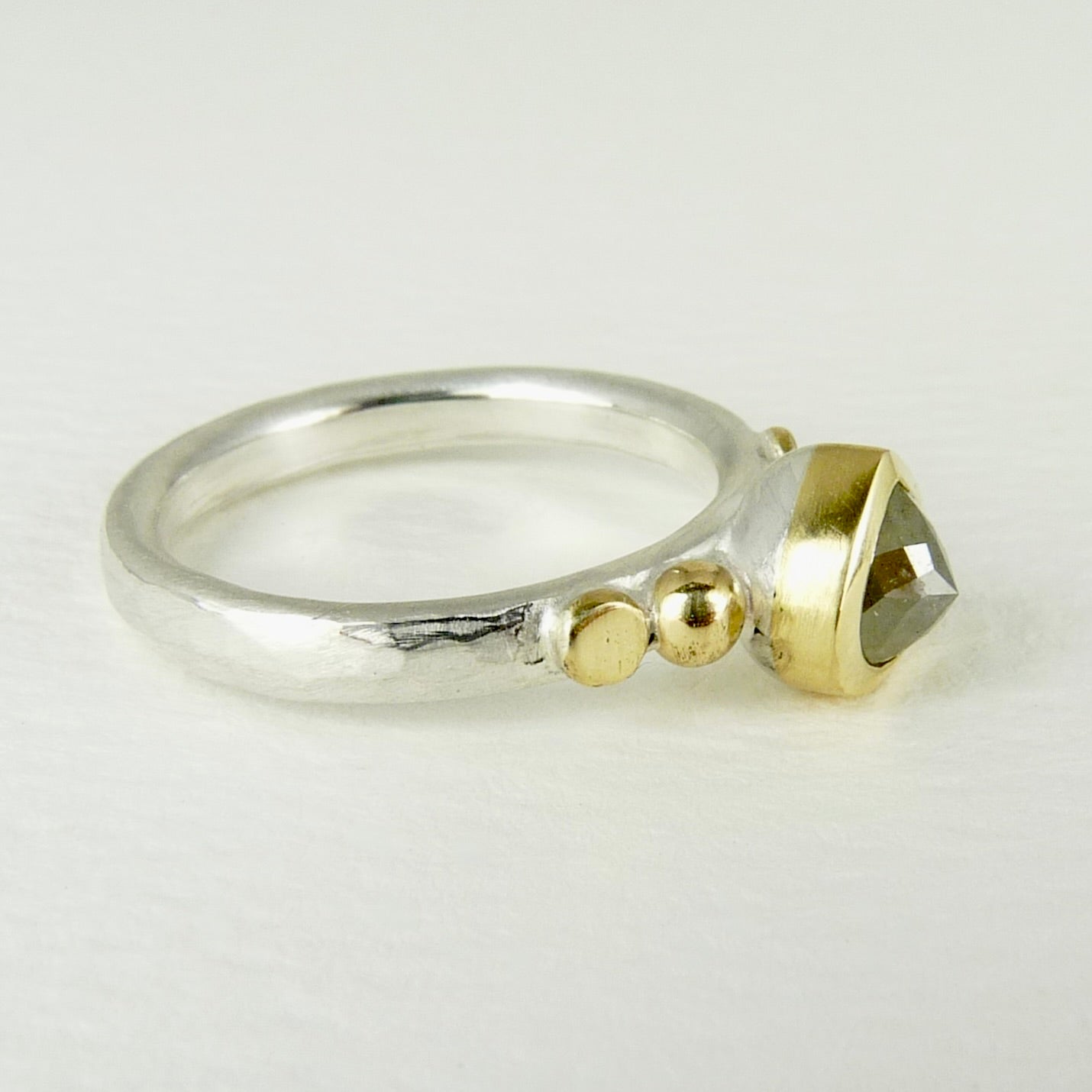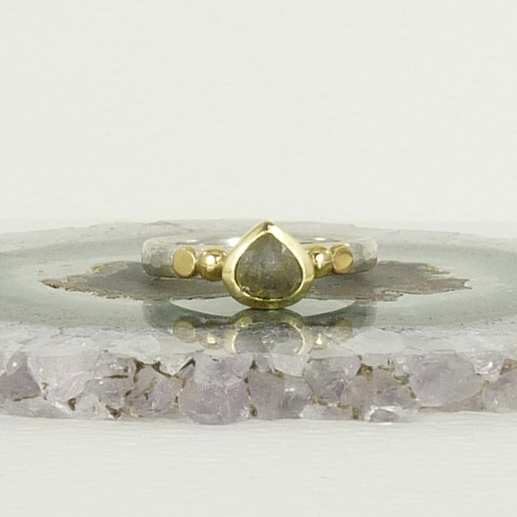 A gorgeous grey tear drop diamond set in 18ct gold, 18ct granules and a sterling silver band