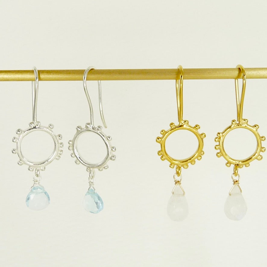 Our lovely tiny granulation circle earrings with hook fitting and gorgeous gemstone drop